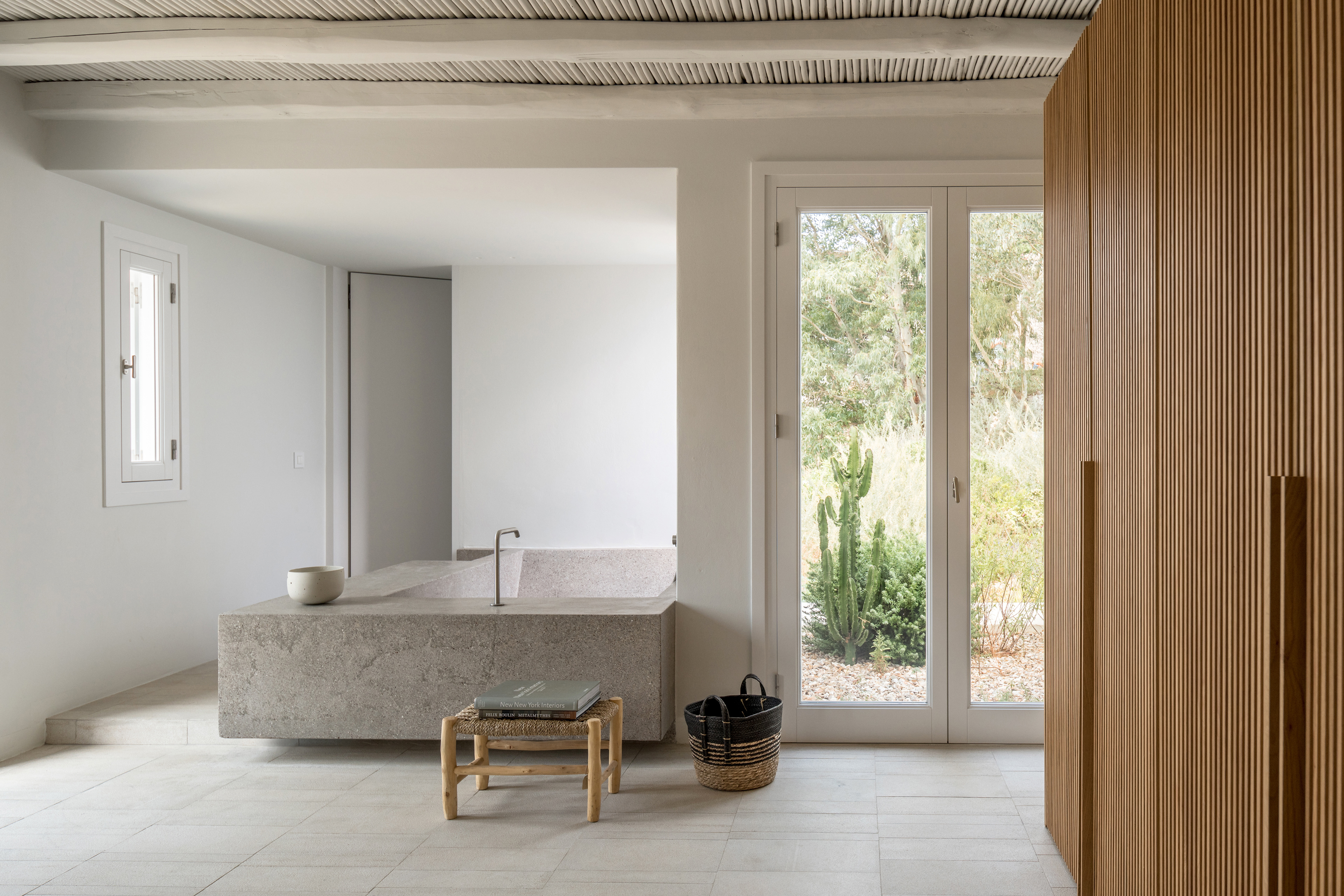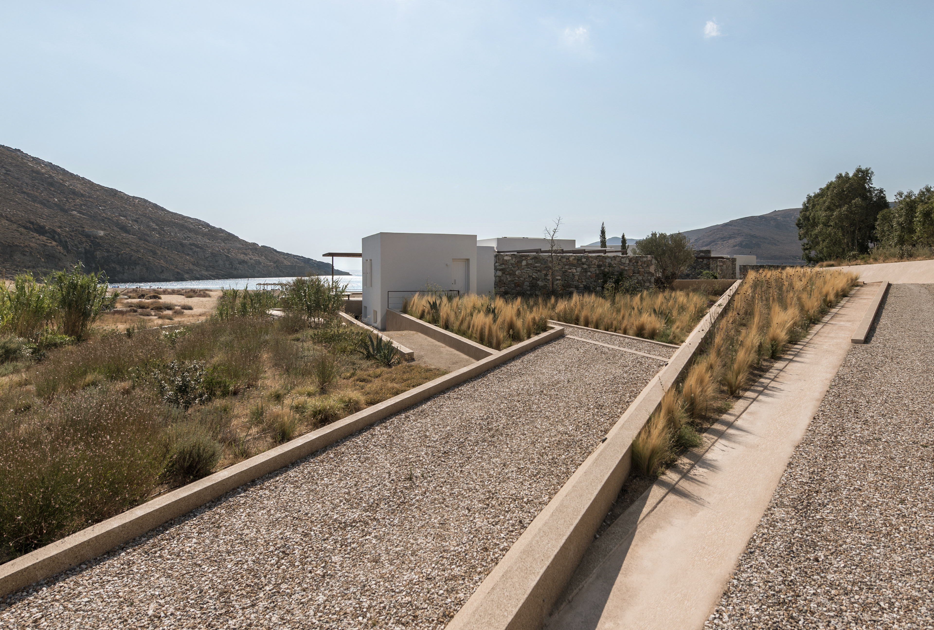 The element of “linear wall” forms the patios. The linear walls are constructed from local dry stone, following the design axes of the three residences, to reinstate the notion of a “hard boundary” that was absent from the initial design. The stone wall boundary, with its completes and voids, is articulated at the rear part of the residences, functioning both as protection against the strong winds of the area, but also as a primary filter separating the public from the private space of the houses, thus ensuring the necessary privacy for the user.