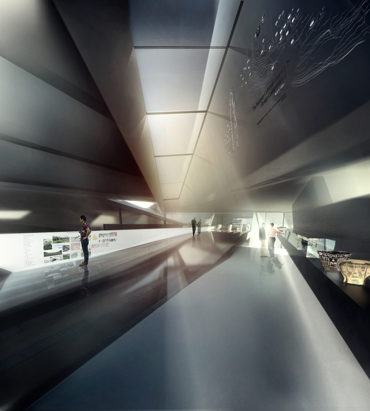 The uniqueness and speciality of the place asks for a careful and systematic approach. We consider appropriate to articulate a cultural building that will organize the fields of view and its forces, representing a contemporary reality through the creation and proposal of a new experience. The Bamiyan Cultural Centre supersedes the notion of a building as a ‘cell’ that could be positioned in any location, and proposes a new reality based on the axis and flows given from site, breaking the boundary between what is interior and what is exterior.  The purpose of the proposal is not to outshine and compete with the rich history and monumentality of the place and the Buddha cavities, but create a building as a vehicle of culture and heritage, complementing and creating a dialogue. A building that aims to organize and illuminate both the cultural treasures of Bamiyan, and also to combine different trends, affinities and orientations, promoting an intercultural interaction in the scope of research and learning.