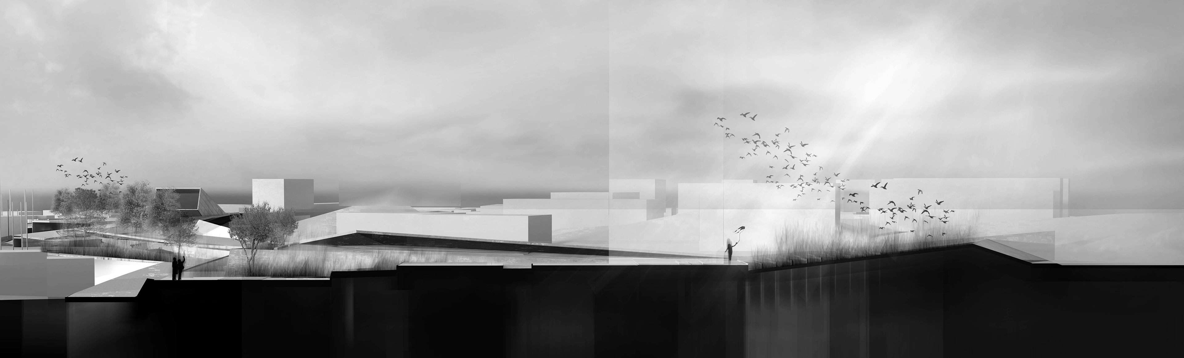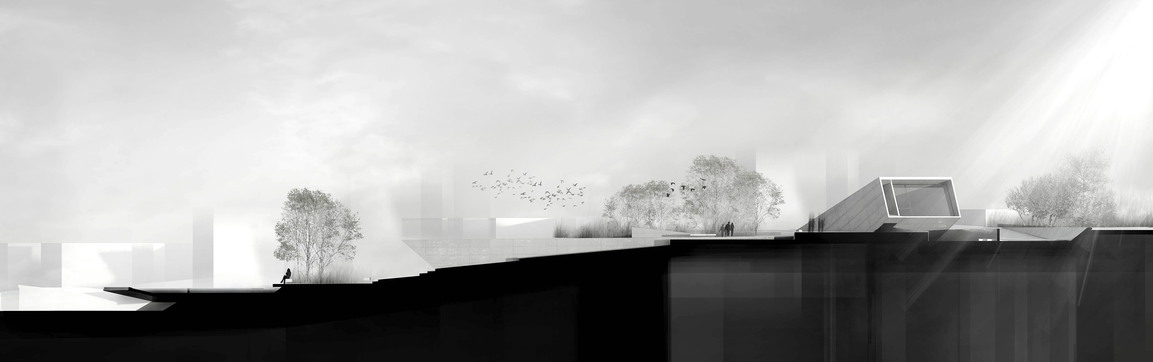 The basic geometrical characteristics of the landscape set the composite trace of the proposal, where the field could be further analysed as a backbone running along the park containing two open surfaces. As a result, the backbone serves as a peripheral artery supplying the heart at the centre of the solution and its surrounding areas. The backbone and the open surfaces, subjected to the rhythm of the pre-existing grid, are transformed to the main route, running across the park and the resting, meditation, communication, and reflection areas interspersed over it.