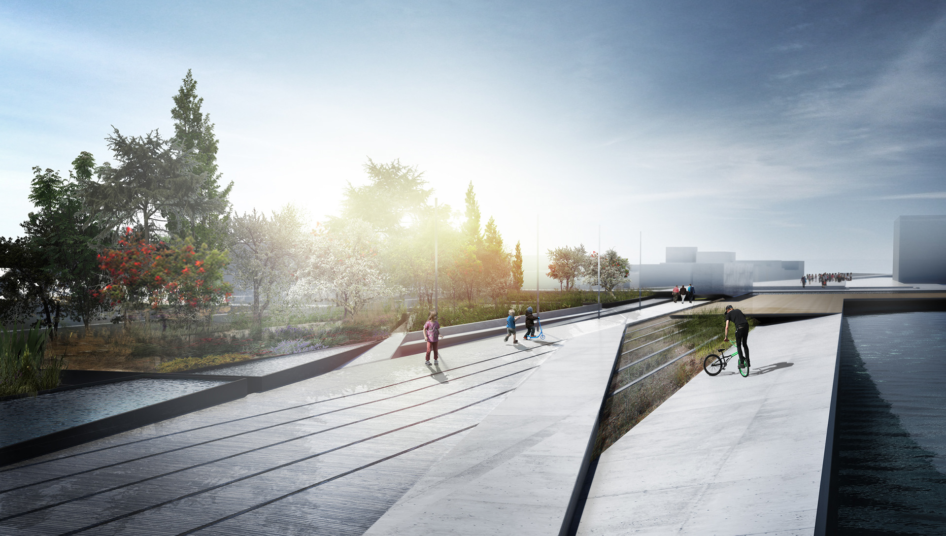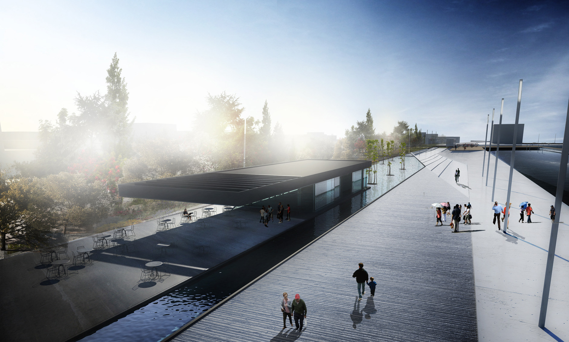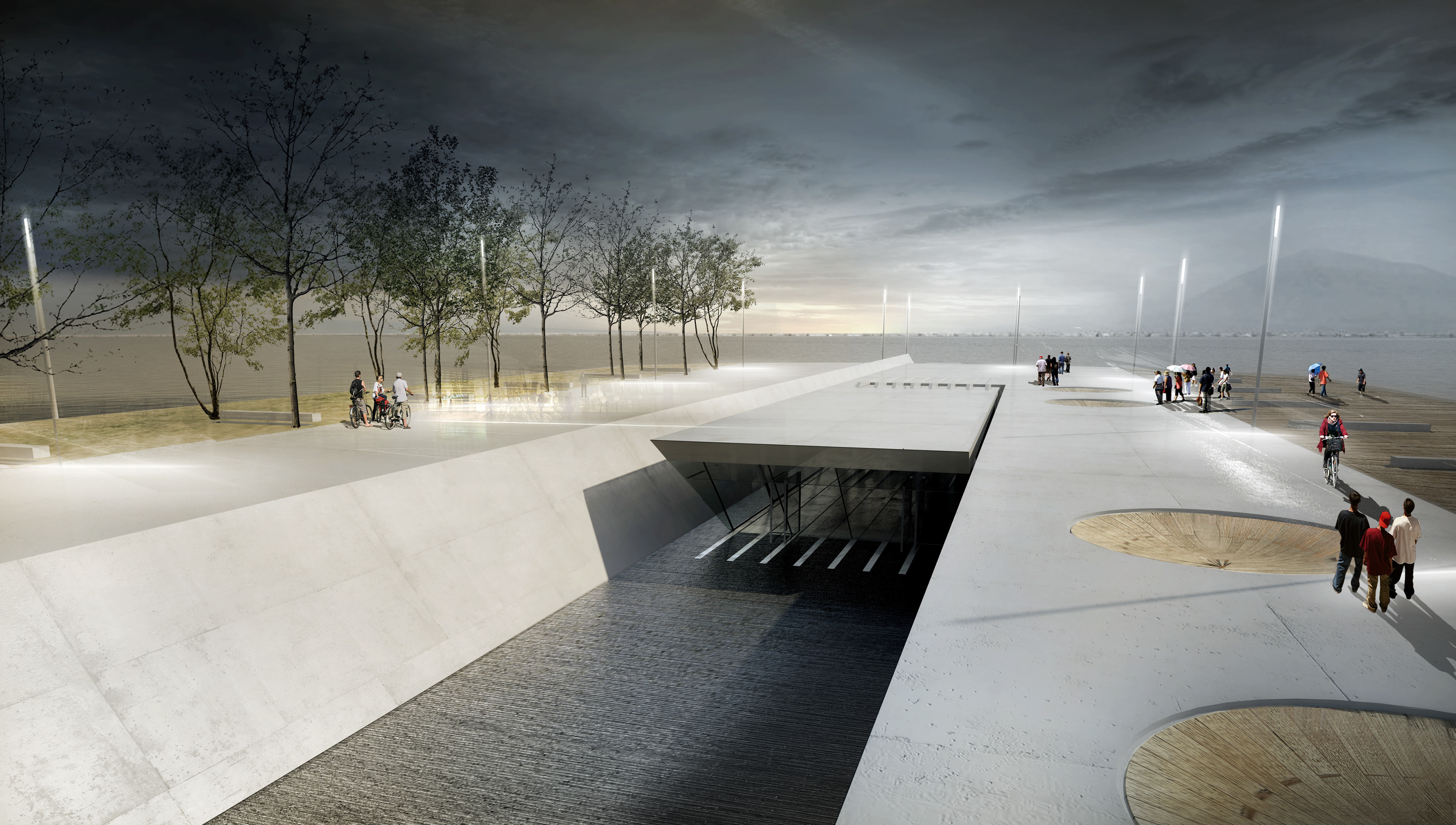 Our whole gesture concerning the redevelopment, acts as a transitional urban veil, which is tucked between the water element and the green areas, setting a new quality of circulation and sight for the visitor. Our intent for the proposed building volumes is not to sit heavily on the ground but to assimilate to their surroundings and become part of the ‘folding’ and ‘unfolding’ of the ground, penetrating its surface, trying to keep the landscape as intact as possible.