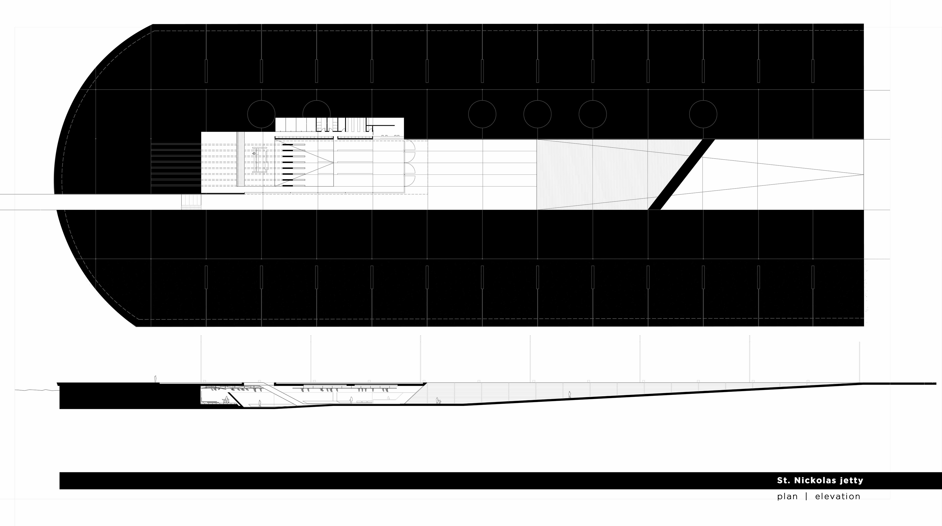 The main axis of interest after analyzing the urban fabric is the one defined by St. Nicolas street, and becomes the driving force of our design, connecting the highest point of the city to the horizon at the level of the sea. We raise a green boundary/barrier of high trees at the edge of Othonos-Amalias street creating a penetrated natural grid, protecting the visitors from the sounds and pollution of the city. We allow the street of St. Nicolas and the three main roads east of it to penetrate the seafront zone and link the cityscape to the seascape. The St. Nicolas jetty becomes the central element of the proposal and becomes the ideal location for the Museum of the city of Patras. Thus a journey is created for the visitor, starting high from the stairs of St. Nicolas and descending gradually to the museum reaching the level of the sea and entering in it.